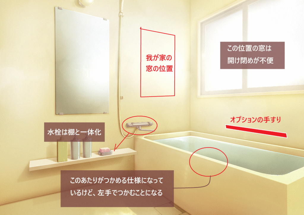 浴槽の配置によりますが、我が家のお風呂で浴槽のフチをつかむなら左手です。右側にはオプションの手すり。右手で浴槽のフチがつかめたならオプションの手すりは必要なかったかもしれません。
