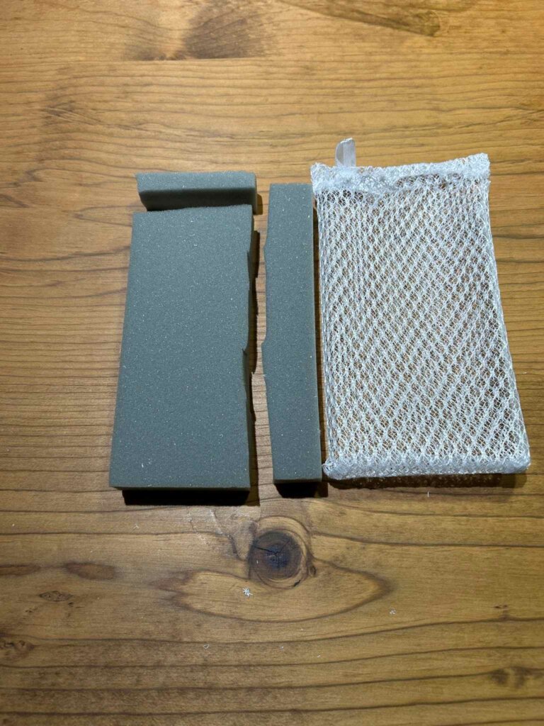 ネット部分の糸をほどいて(というか、切り開いて)スポンジを好きな大きさにカット。